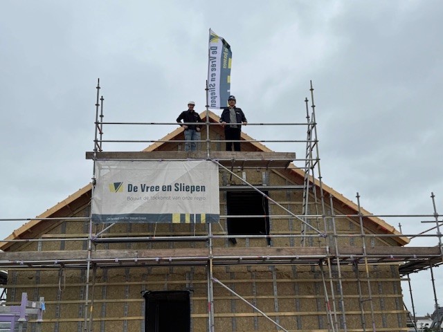 Geen pannenbier, maar lekkere warme broodjes bij de lunch. Thius verraste de vakmannen van De Vree en Sliepen op donderdag 18 september bij het bereiken van het hoogste punt van Blommeland 2. René Wiersema, directeur-bestuurder van Thius, en Wim van Vreeswijk, directeur van De Vree en Sliepen, spraken hun waardering uit voor de inzet op de bouwplaats. Vervolgens hesen Atdhe Lila, junior projectleider bij Thius, en uitvoerder Marco Luiten van De Vree en Sliepen samen de vlag.